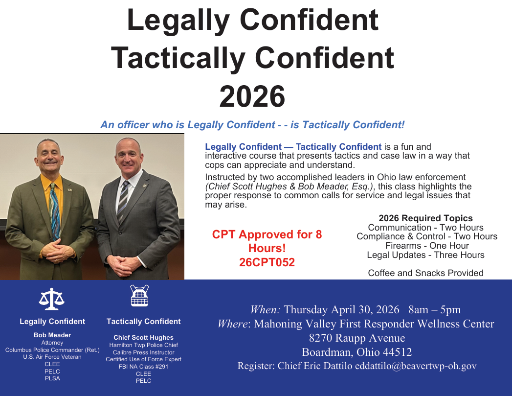 Command Ready: Law. Tactics. Leadership. is a fast-paced leadership course built for Ohio law enforcement supervisors, focusing on legal clarity, tactical confidence and leading under pressure. Designed for sergeants through command staff, it provides practical tools to reduce liability, strengthen performance, and lead decisively in both daily operations and critical incidents.